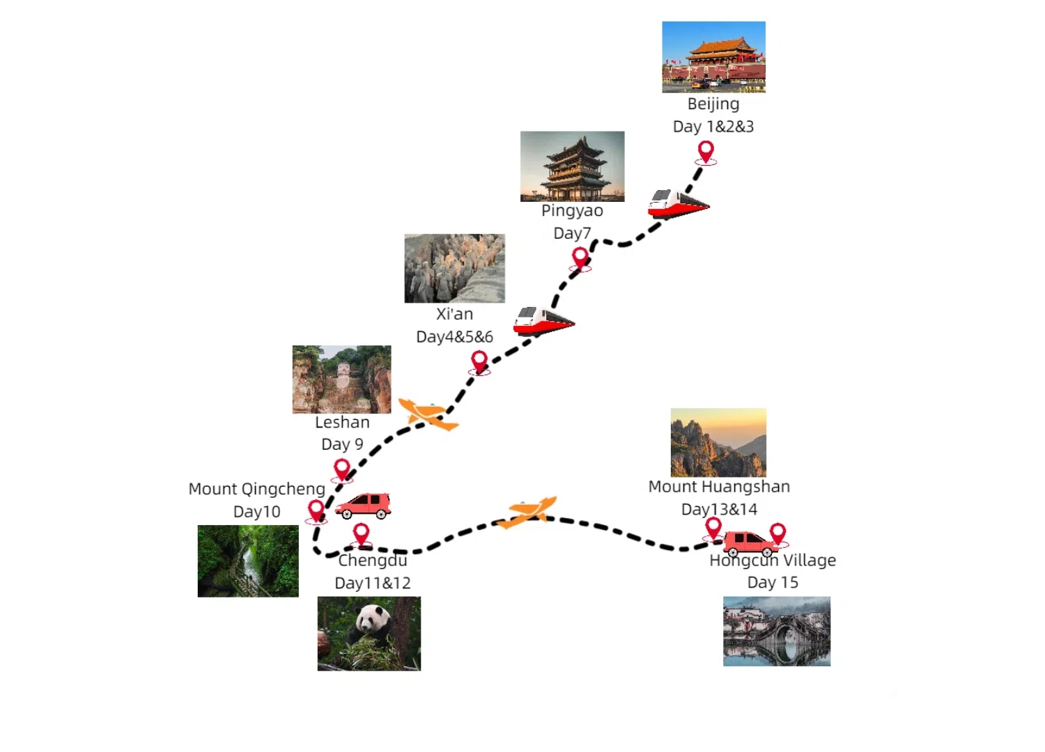 You can arrange for your international flight to get to Beijing. We will meet you at the airport. Then transfer you to the hotel and check you in. Feel free at leisure for the rest of the day.