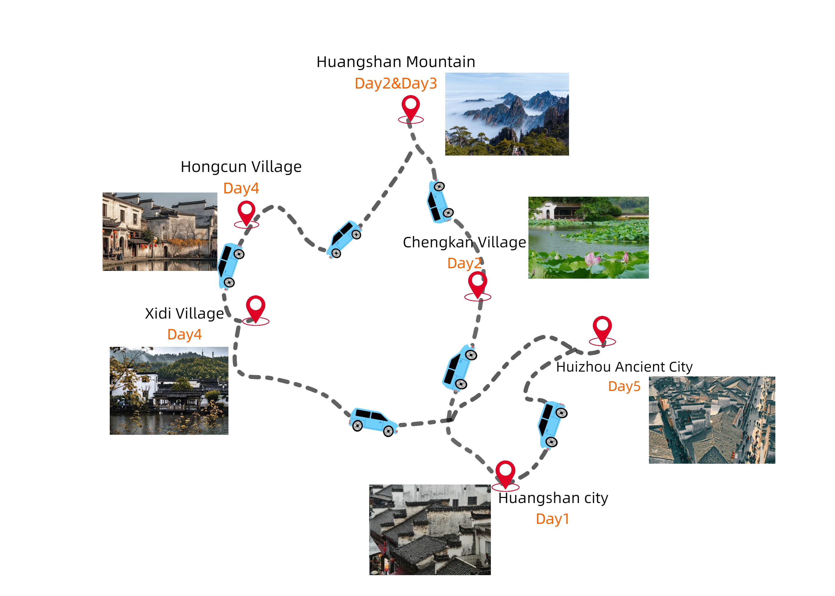 Route: Huangshan City → Hongcun Village → Xidi Village → Hotel