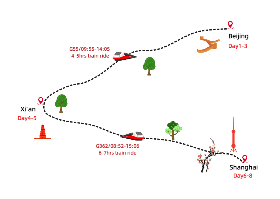 We will depart from Xi'an to Shanghai by train this morning. The journey is expected to take about 6-7hrs, you can prepare some of your favorite snacks the day before.