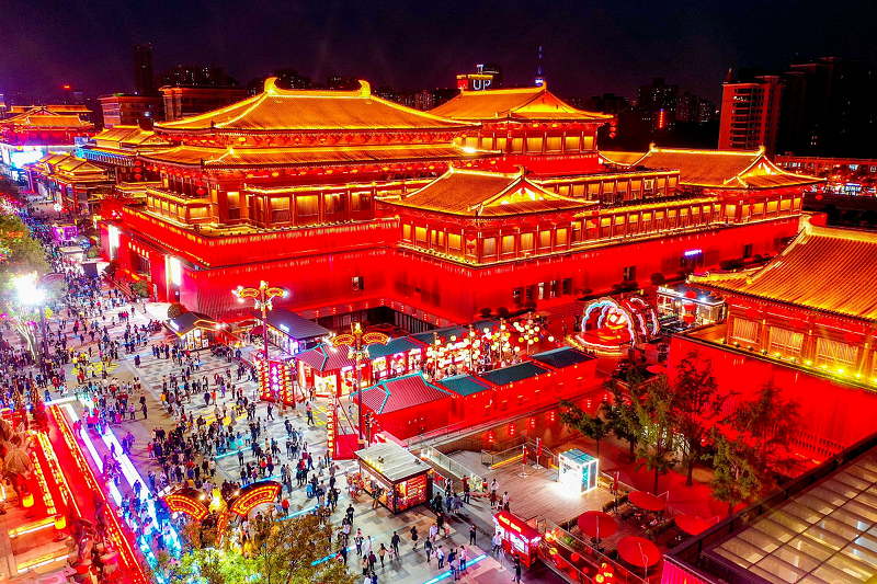 Walk through the lively pedestrian street of the Tang Dynasty Never Nights City, featuring Tang-style architectural complexes. Enjoy exciting street performances, experience the prosperity of ancient markets, and savor authentic Xi'an snacks.