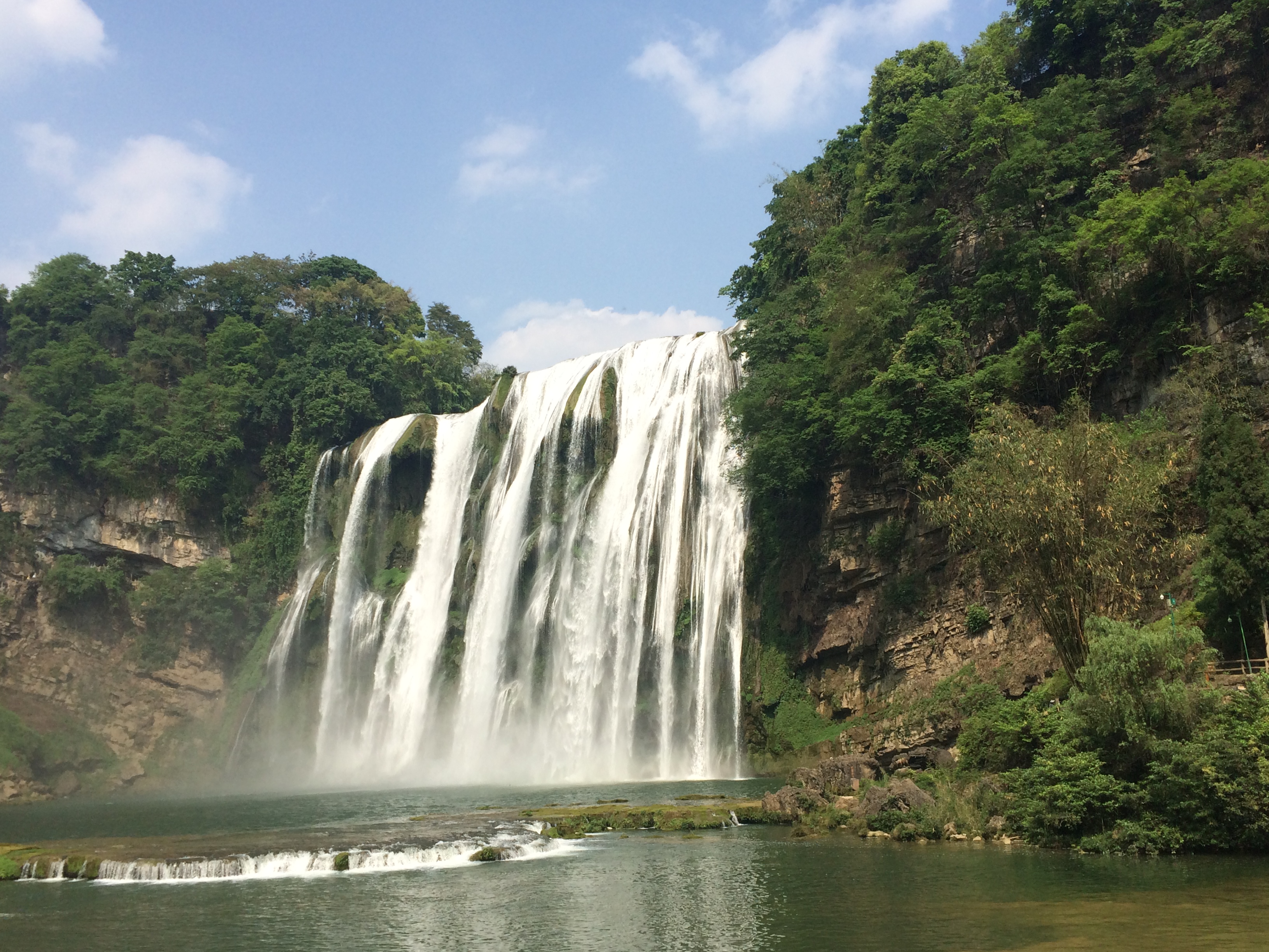 Dear friends, after a delicious breakfast, we're off to see one of the most spectacular sights in China and Asia–the Huangguoshu Waterfall! This is the crown jewel of Guizhou's tourist attractions. Just imagine, it's a whopping 101 meters wide and drops a staggering 78 meters into the Rhinoceros Pool, which is 11 meters deep and shaped like a rhinoceros. The force of the water creates foam that shoots up to 100 meters in the air! You can hear the thunderous roar of the waterfall from kilometers away. And on sunny days, rainbows add a magical touch to this already majestic sight.