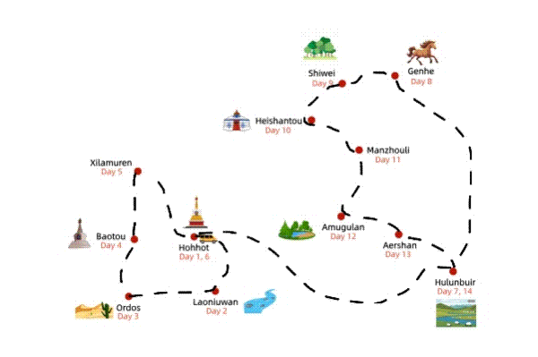 Destinations: Hohhot - Laoniuwan - Ordos - Baotou - Hailaer - Genhe - Shiwei - Heishantou - Manzhouli - Amugulang - Aershan - Hailaer