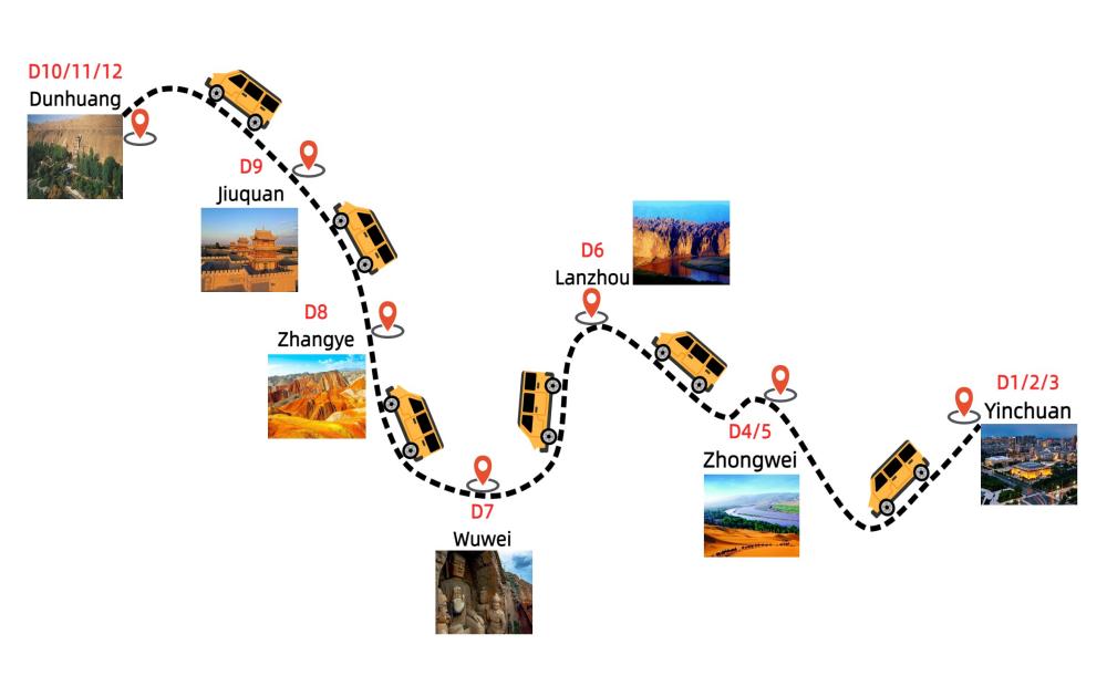 Destinations: Yinchuan - Zhongwei - Lanzhou - Wuwei - Zhangye - Jiuquan - Dunhuang