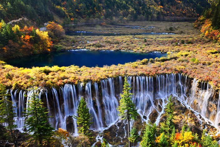 Full day sightseeing in Jiuzhaigou. Jiuzhaigou is known for its many multi-level waterfalls and colorful lakes, and was declared a UNESCO World Heritage Site in 1992. It belongs to the category V (Protected Landscape) in the IUCN system of protected area categorization.Then, You can take the tourist bus to the top, when you get there, you can walk down part way and take the bus down the rest of the way.
