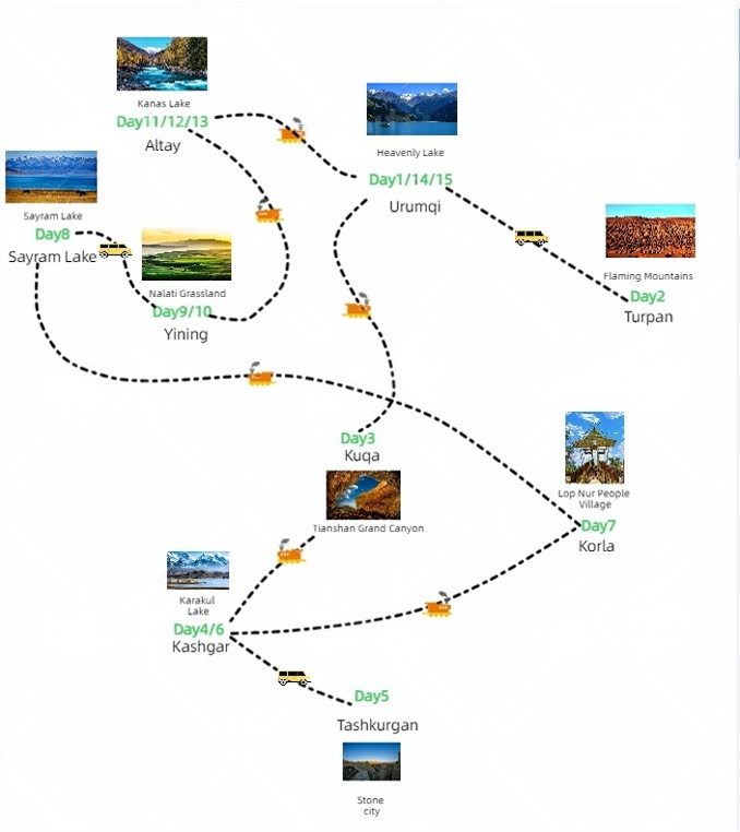 Destinations: Urumqi-Turpan-Kuqa-Kashgar-Tashkurgan-Korla-Yining-Altay