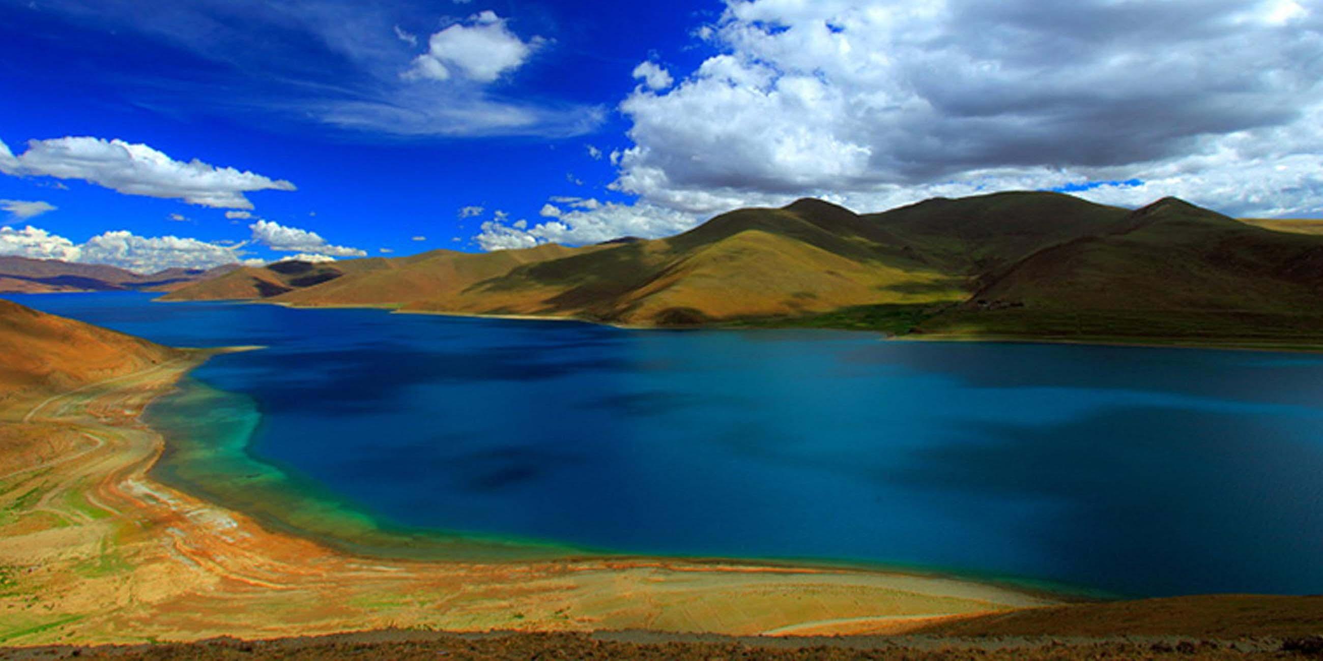Marvel at the Yamdrok Lake, one of Tibet’s most sacred lakes, surrounded by snow-capped mountains.