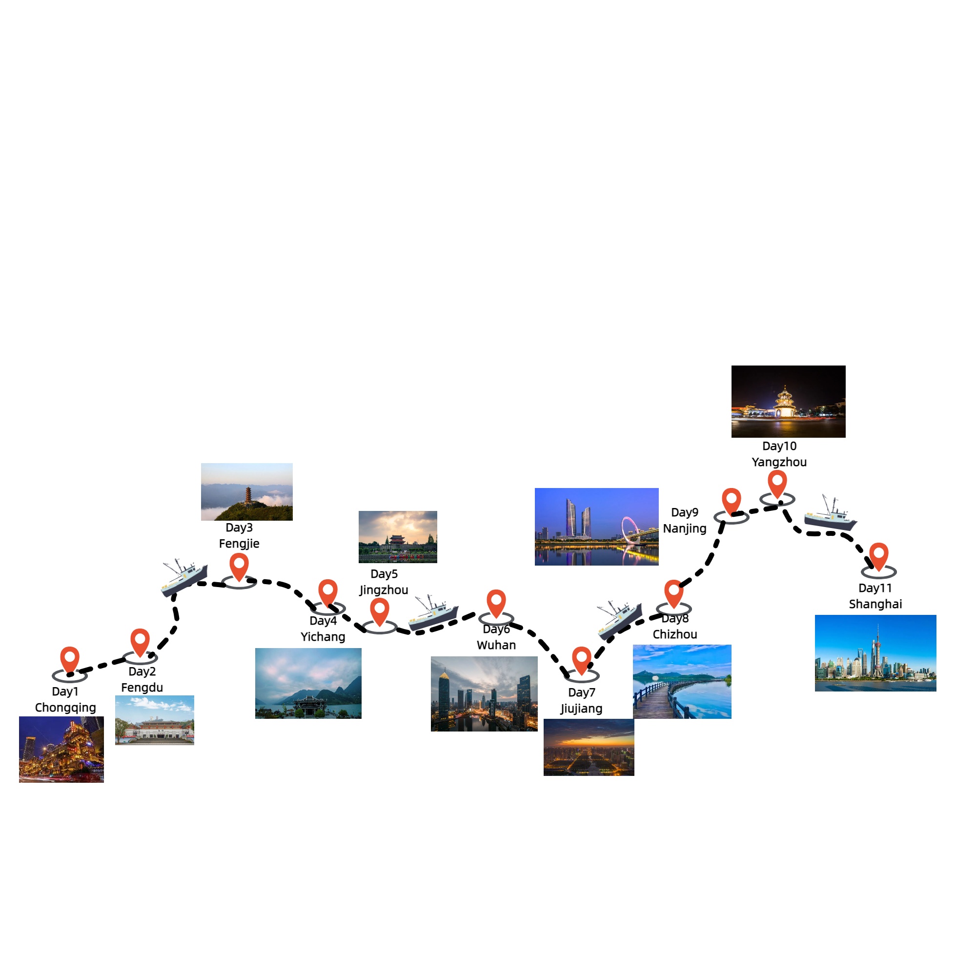 Destinations: Chongqing-Fengdu-Fengjie-Yichang-Jingzhou-Wuhan-Jiujiang-Chizhou-Nanjing-Yangzhou-Shanghai