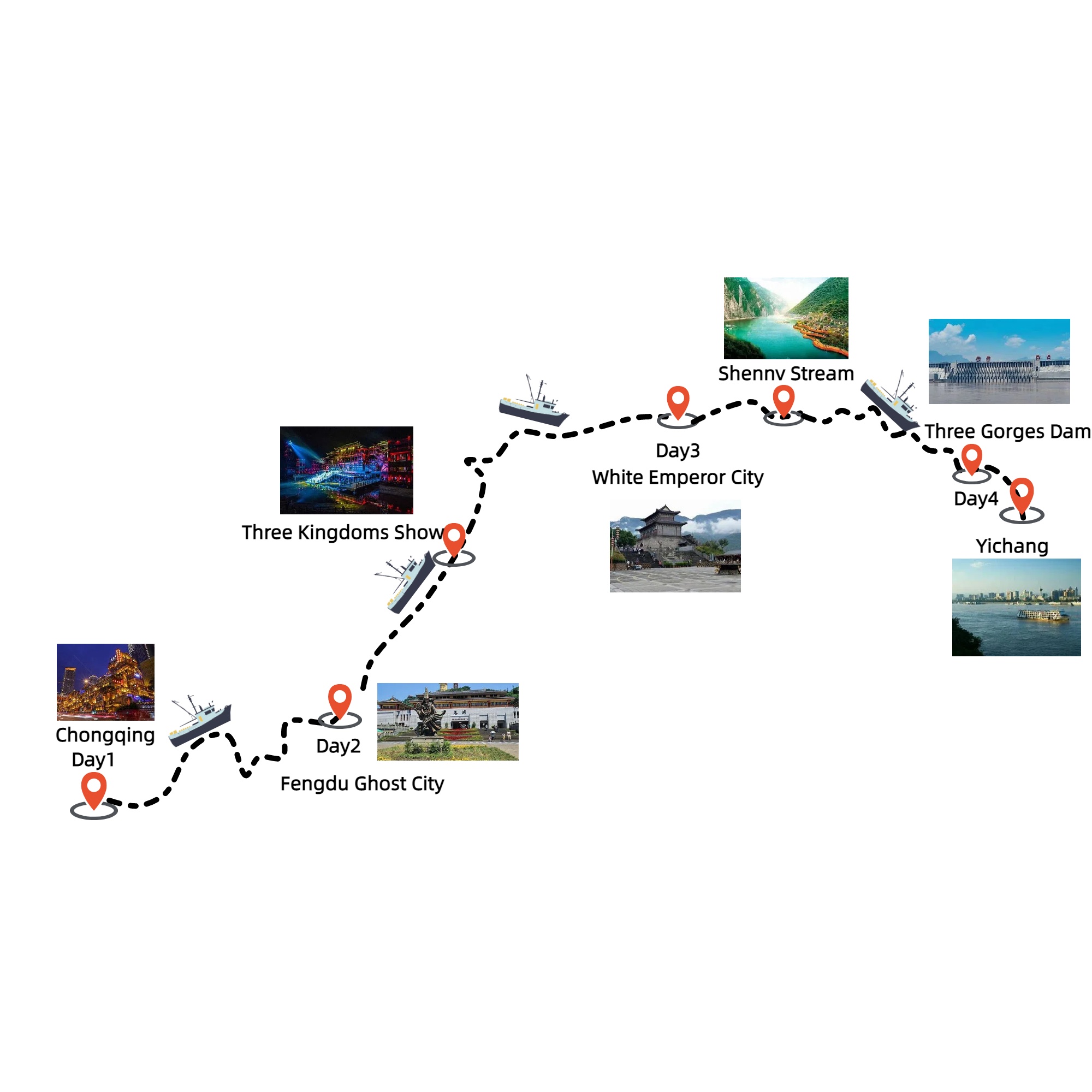 Destinations: Chongqing-Fengdu County-Zhong County-Fengjie County-Wushan County-Zigui County-Yichang