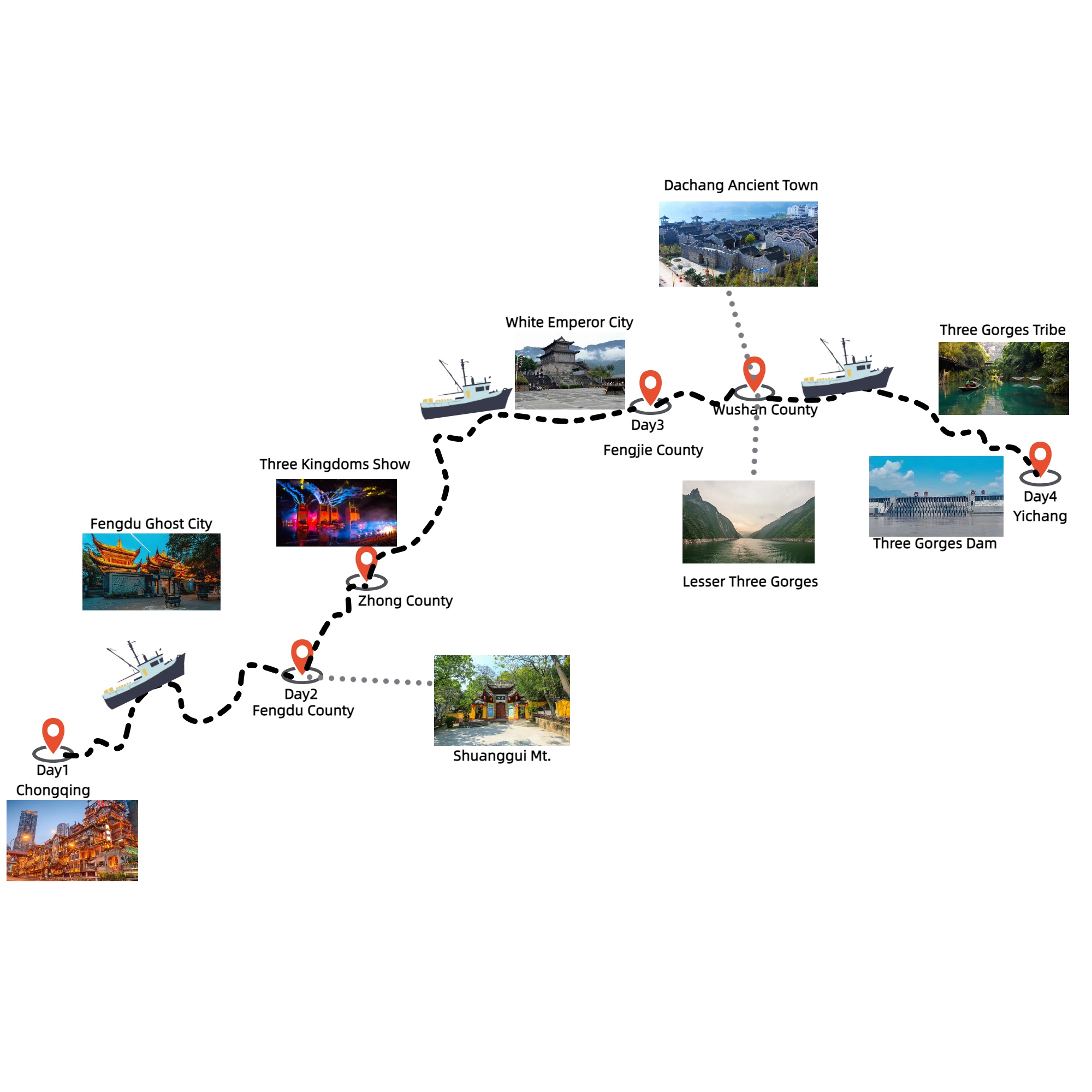 Destinations: Chongqing-Fengdu County-Zhong County-Fengjie County-Wushan County-Yichang