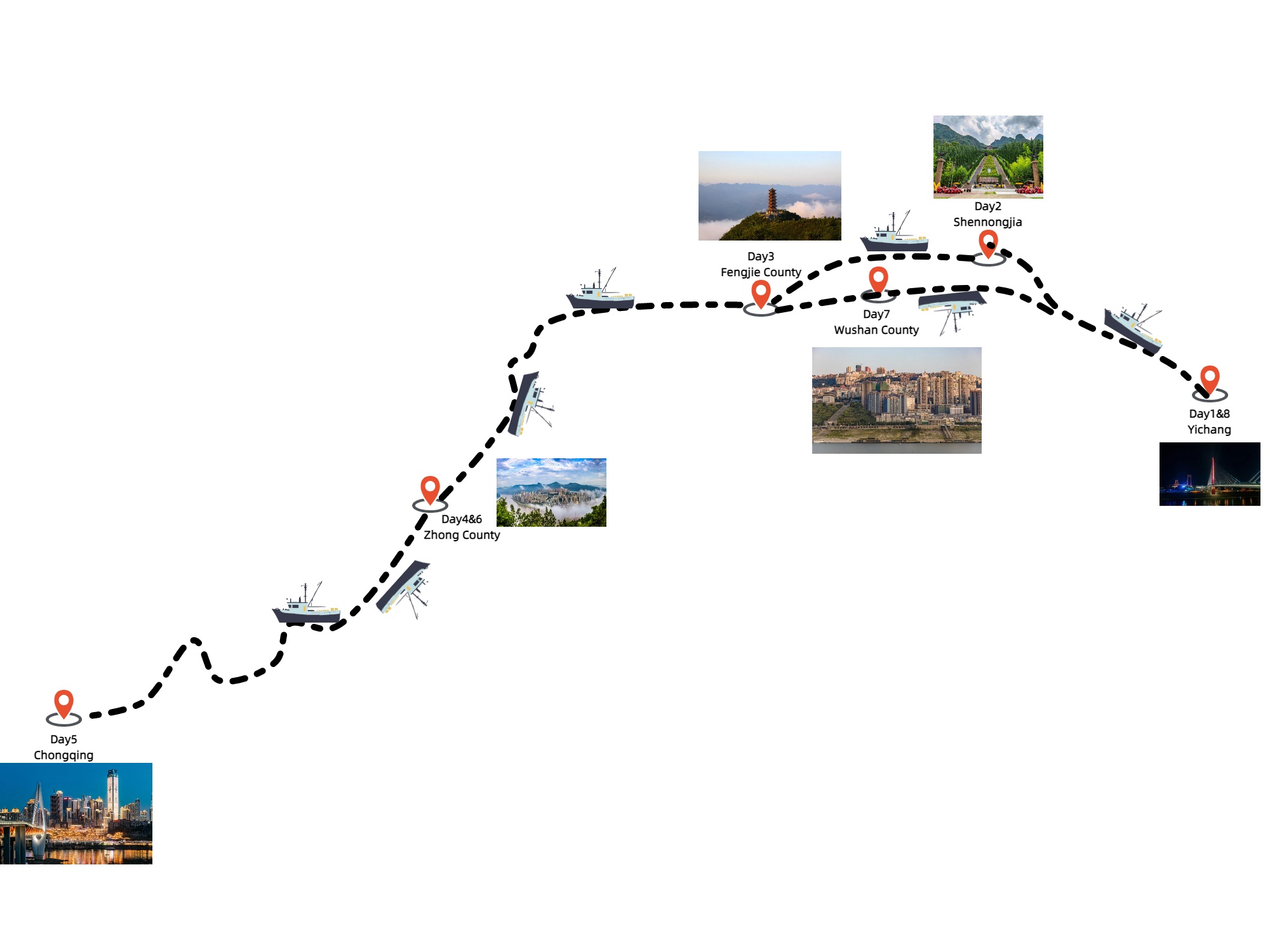 Destinations: Yichang-Shennongjia-Fengjie County-Zhong County-Chongqing-Zhong County-Wushan County-Yichang