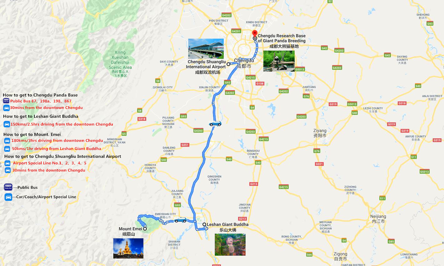 There are many buses directly leading to the Panda Base. You can take them nearby: Panda base - Wuhou Temple, panda base -Sanxingdui, and Panda Base - Airport shuttle bus.