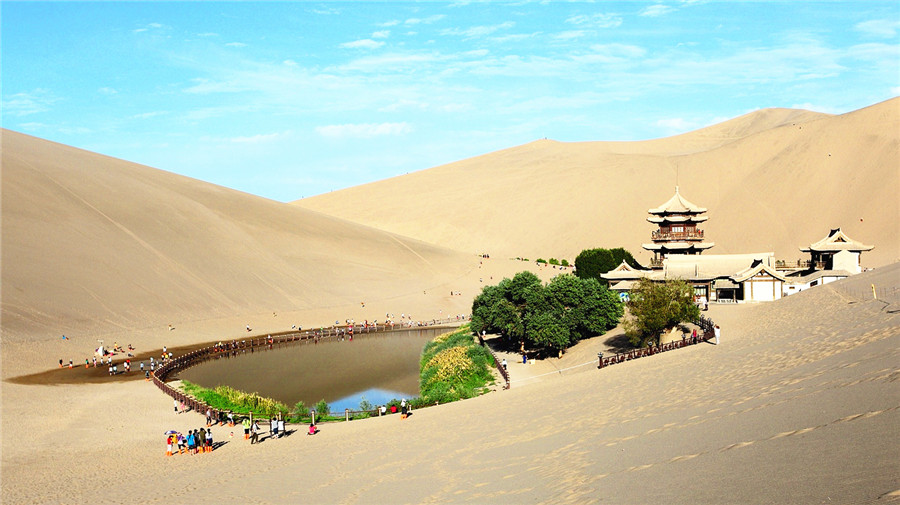 After lunch, 4hrs driving to Dunhuang to visit Echoing Sand Mountain, where you can ride the camels for 40mins to experience the beautiful desert scenery in the sunset.
