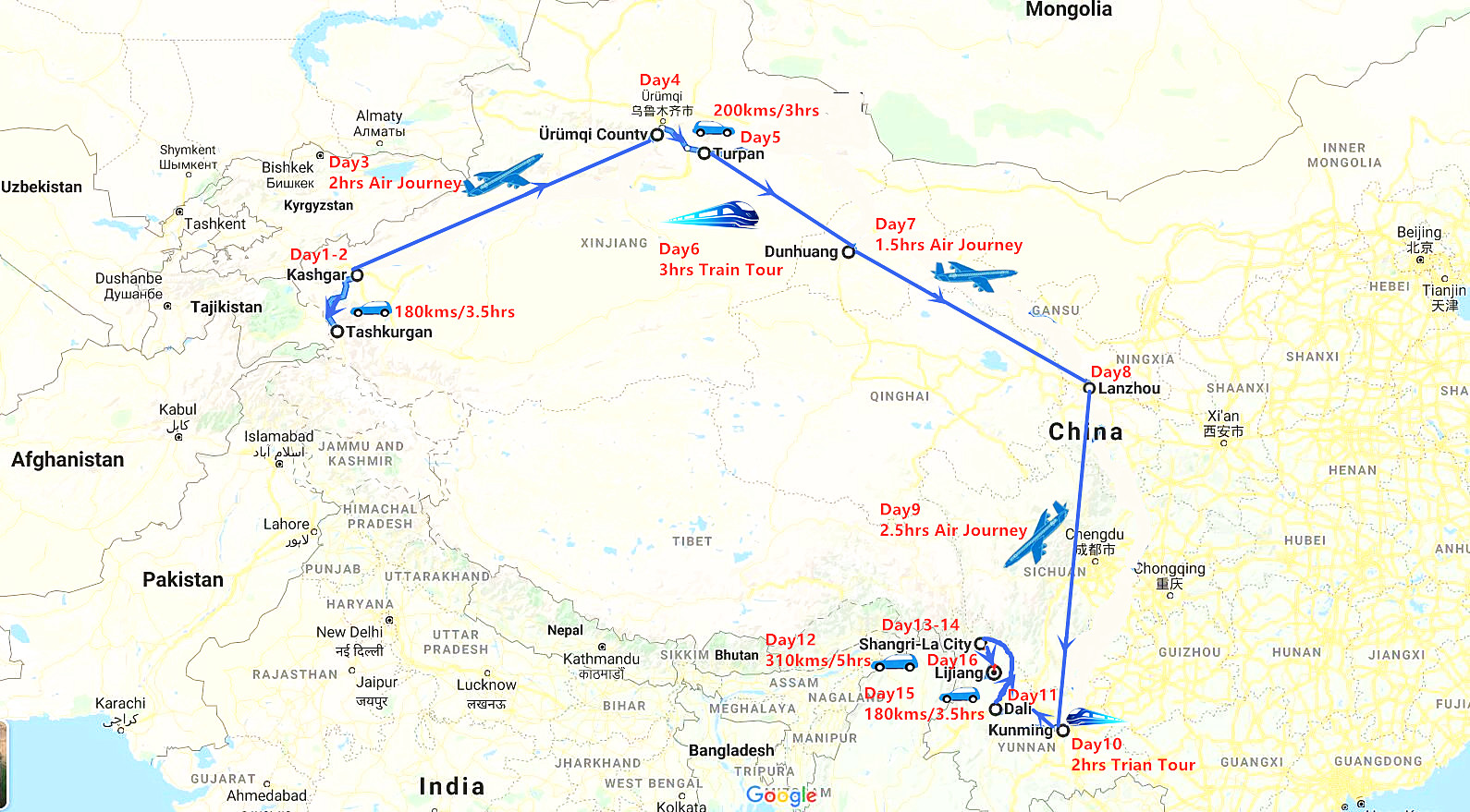 Domestic flights from Kashgar to Urumqi, from Dunhuang to Lanzhou, from Lanzhou to Kunming