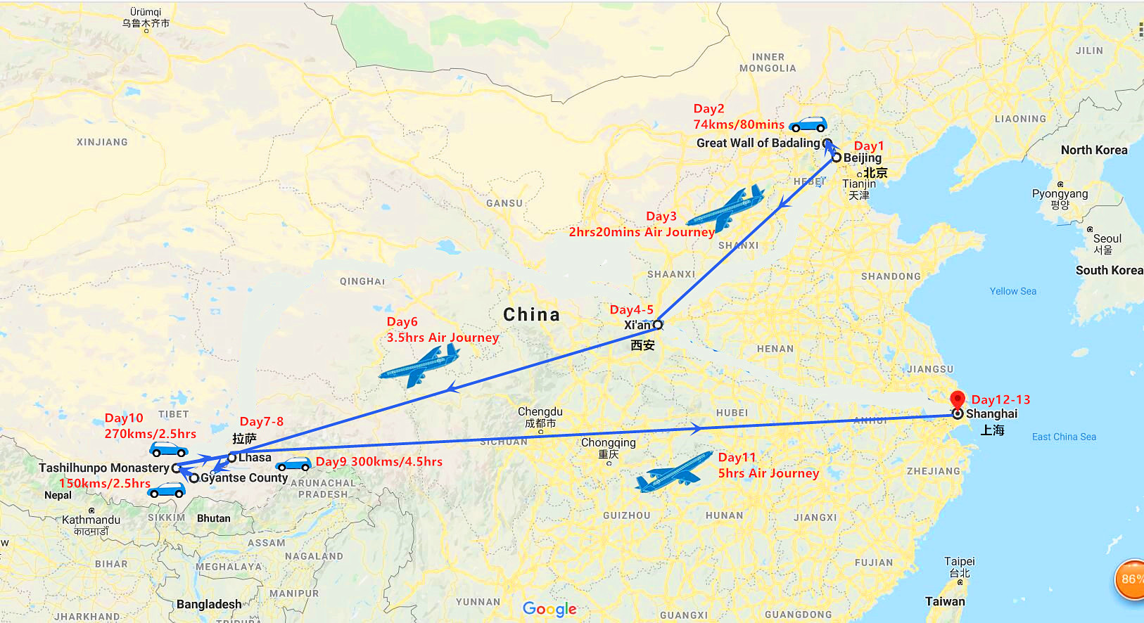 Domestic flights from Beijing to Xi'an, from Xi'an to Lahsa in the itinerary and from Lahsa to Shanghai.
