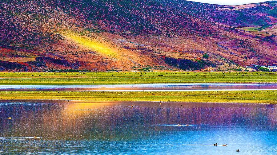 Napa Lake: Napa Hai ("Lake behind the forest") Nature Reserve is a state-designated wetlands area situated some 8 kilometers north of Shangri-La County (aka Zhongdian County) on the Yunnan - Guizou Plateau in northwestern Yunnan Province. Not surprisingly, this wetlands area is a true paradise for all types of birds, most especially for waterfowl. In spring, the higher, drier parts of the reserve is a prairie landscape carpeted with flowers. Parts of this prairie are farmed, the main crop being highland barley.