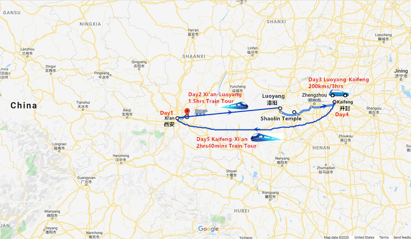 2nd class express train from Xi'an to Luoyang, and Luoyang to Xi'an listed in the itinerary.