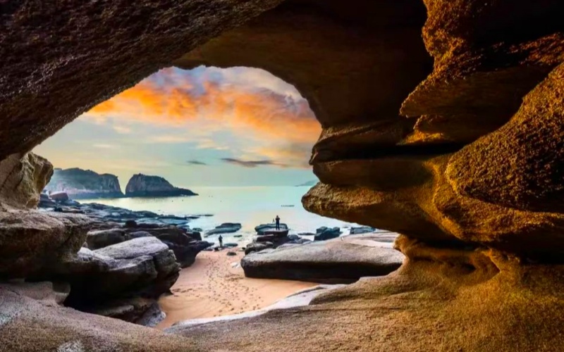 Next travel to Liuyun Cave (留云洞), A boulder "a tile" supported by natural pillars constitutes a wonderful Liuyun cave. Surrounding the cave are rugged rocks with different shapes, like a camel watching the waves, an eagle watching the sun, a jade rabbit watching the moon, and a pair of lions playing with beads. Sansha Liuyun Cave has always been a famous tourist attraction at the junction of Fujian and Zhejiang, attracting tourists from all over the world to come here and write poems and letters.
