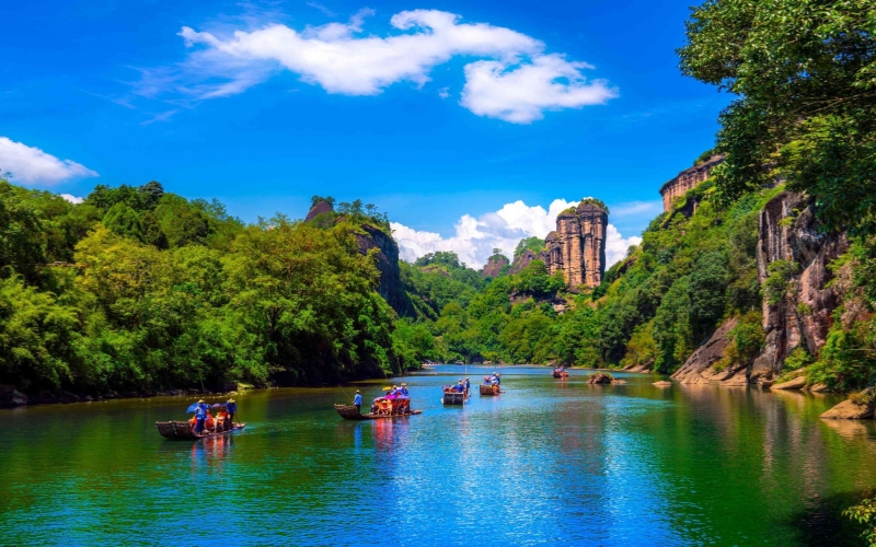 Explore Mount Wuyi, a World Natural and Cultural Heritage Site, enjoy floating down along the Jiuqu Stream on bamboo rafts between two sides of the mountain.