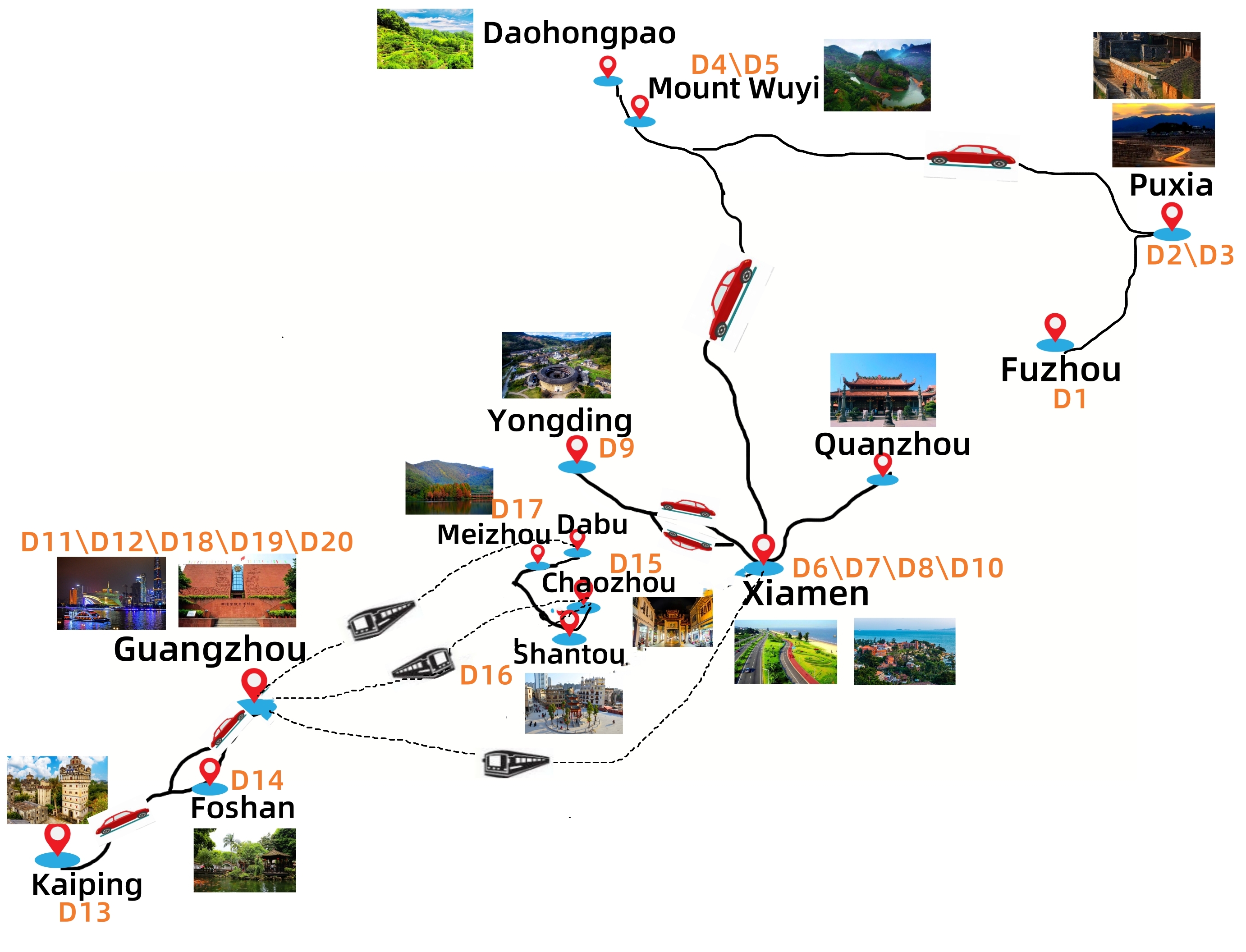 Destinations: Fuzhou - Xiapu - Mount Wuyi - Xiamen - Quanzhou - Yongding - Guangzhou - Kaiping - Foshan - Chaozhou - Shantou - Meizhou - Dabu