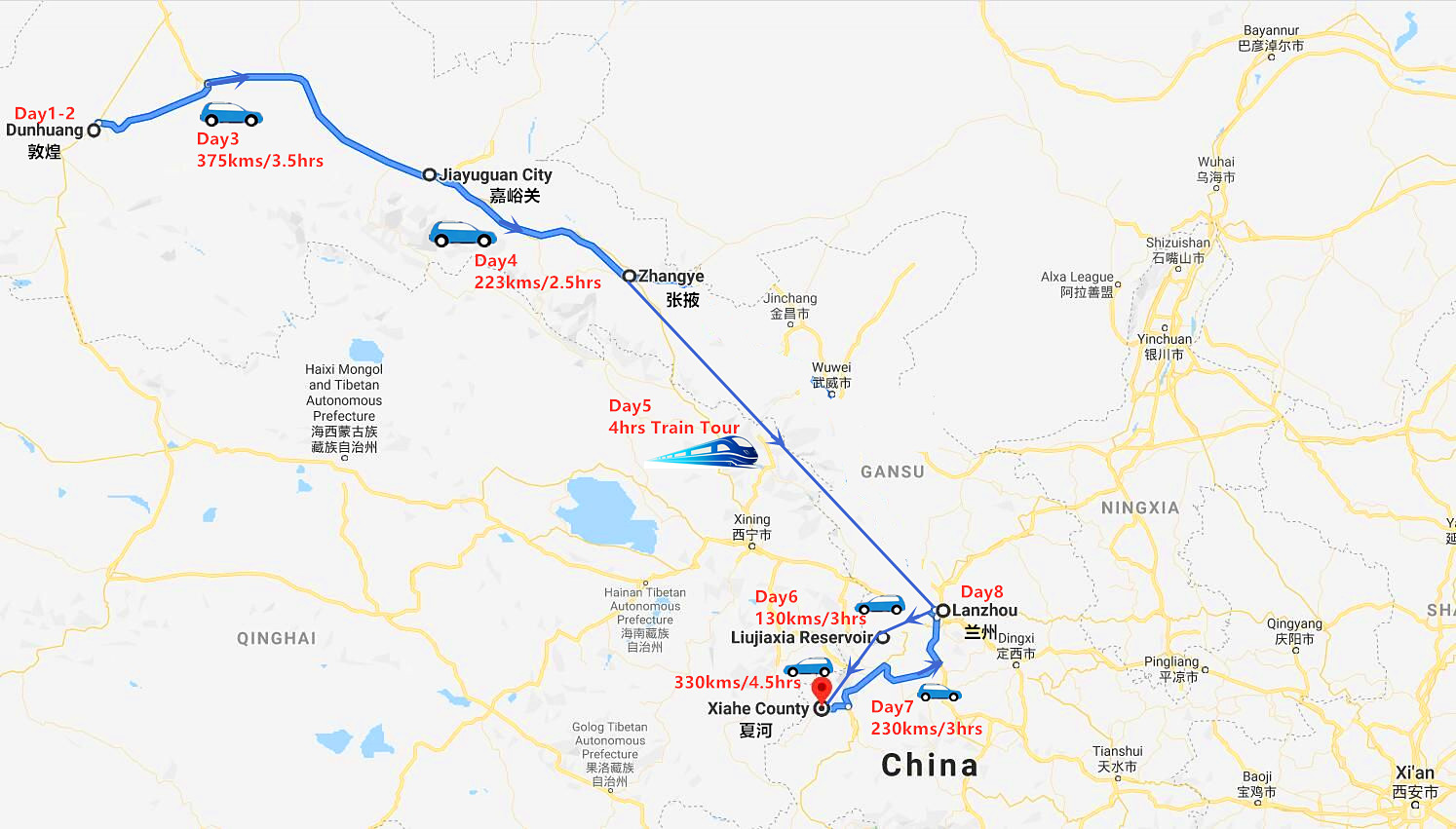 2nd class express train from Dunhuang(Liuyuan Station) to Jiayuguan, from Zhangye to Lanzhou and from Lanzhou to Xiahe listed in the itinerary
