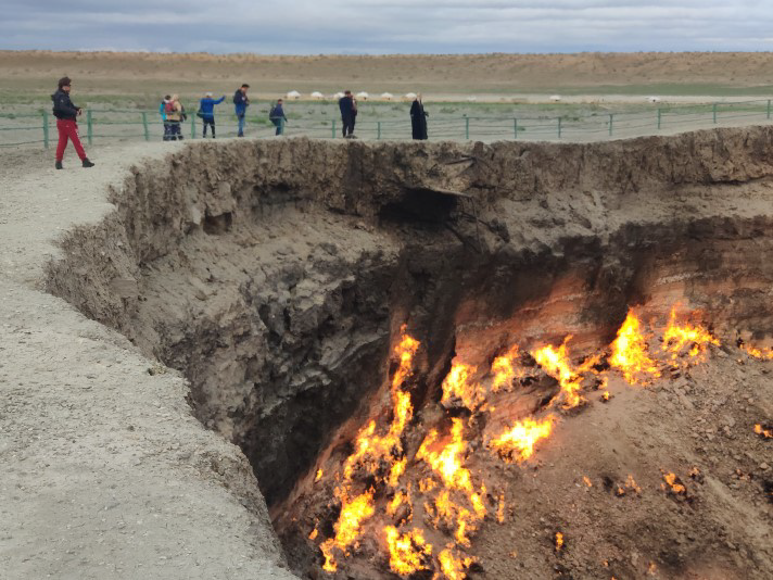 Afternoon drive to Darwaza burning Gas Crater (3.5 h) The Crater is also called as "The Door to Hell". The area is rich in natural gas. While drilling in 1971, former Soviet geologists tapped into a cavern filled with natural gas. The ground beneath the drilling rig collapsed, leaving a large hole with a diameter of 60m and 20m deep. To avoid poisonous gas being discharged, they decided to burned it off. The geologists had hoped the fire would be put out in several days, but the gas is still burning today. In the evening, it is cool to watch the spectacular and fascinating view of the gas crater.