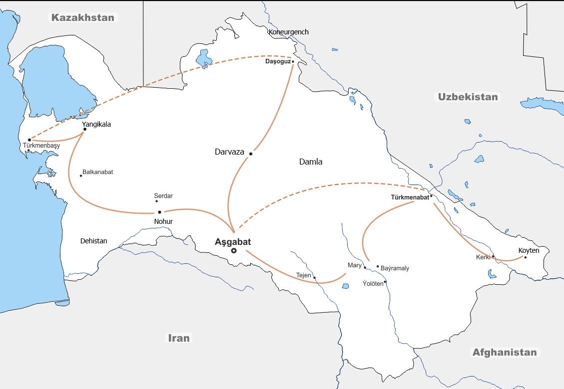Destinations: Ashgabat - Kowata - Nohur - Yangikala - Turkmenbashi - Dashoguz - Darwaza - Ash-gabat - Mary - Koyten - Turkmenabat - Ashgabat