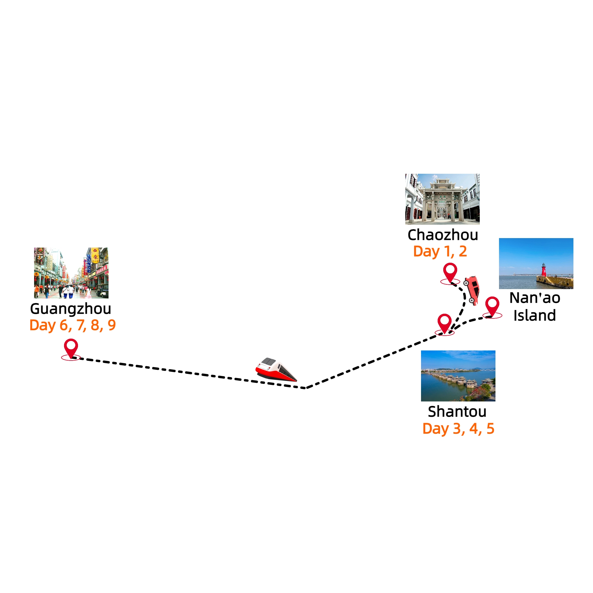 Take a morning train to Chaoshan Station, upon arrival, the guide will be waiting for you at the exit.
