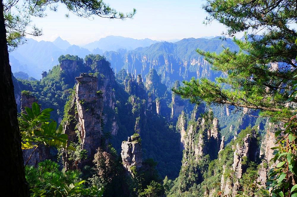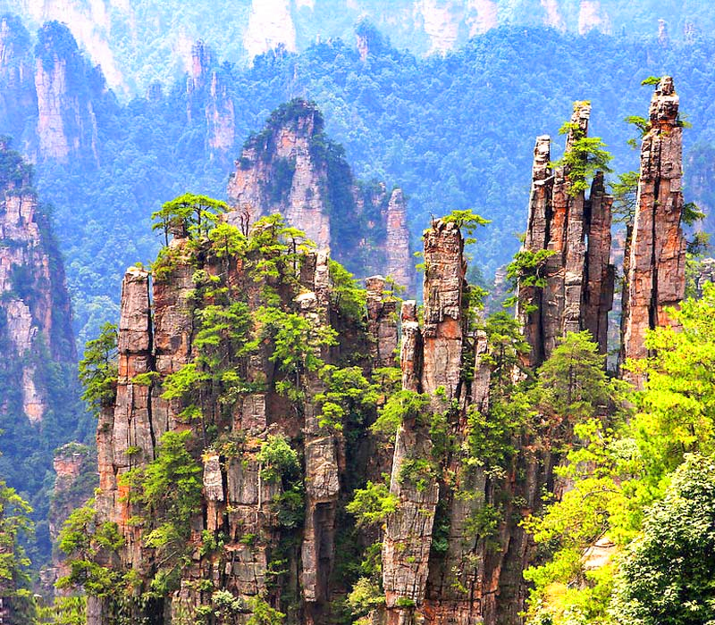 Then descend from the super Bailong Elevator, the world’s highest and fastest elevator. Afterwards, take a sightseeing bus to the magnificent Tianzi Mountain and you will marvel at spectacular wall-like mountain peaks. In different seasons and times, the mountains show a different view.
