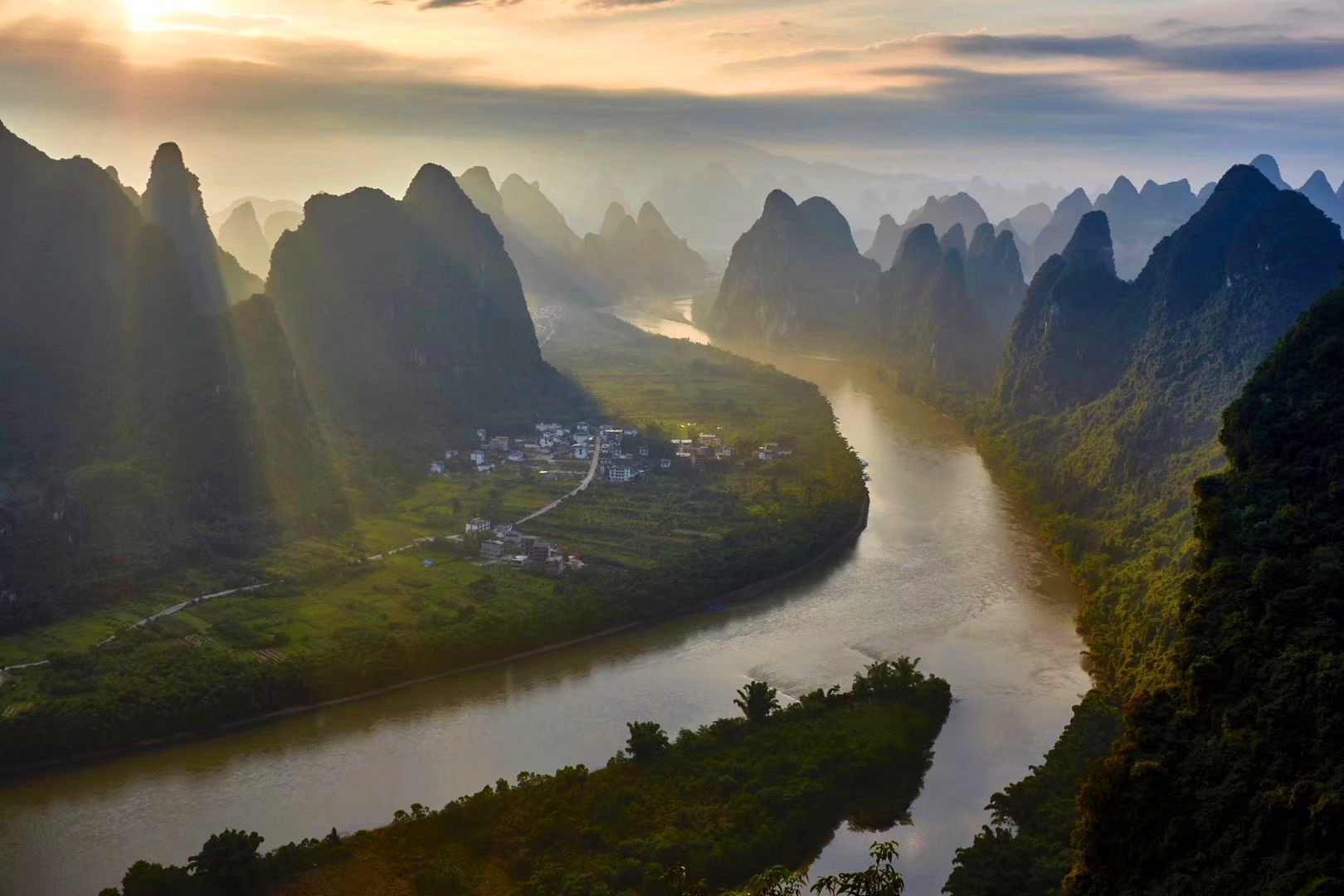 Morning excursion starts from Xianggong Hill, located on the west bank of the Li River, about 28 kilometers from Yangshuo. Climb Xianggong Hill and look up into the distance. The peaks are arranged in an orderly manner, with limpid Li River winding in the arms of the mountains. The light and shadow, sea of clouds, sunrise and rosy clouds here attract countless photographers. Being in Xianggong Hill, it is like coming to the pastoral mountains under Tao Yuanming’s pen, your body and mind are relaxed to the utmost.
