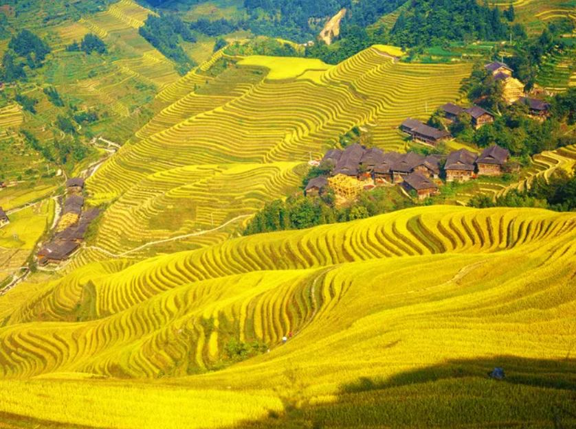 Longji Rice Terraces, literally Dragon's Backbone Rice Terraces, gains its name because therice terraces resemble a dragon's scales and the mountain range looks like the backbone of adragon. lt is reputed as one of the most beautiful rice terraces in the world.