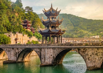 Zhenyuan Ancient Town, a renowned “Mountain Cliff Architecture Museum” in China, offers a captivating tapestry of ancient lanes and paths. Stone bridges and city walls dot the landscape, while the town is encircled by a river of emerald hue and a misty veil that adds to its dreamlike charm.
