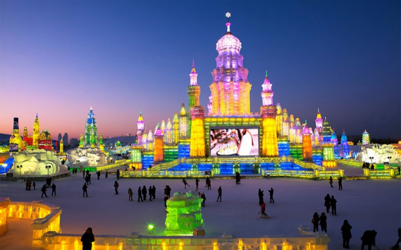 Immerse yourself in the breathtaking Ice & Snow World and Snow Sculpture Art Exposition during the festive Ice & Snow Festival.