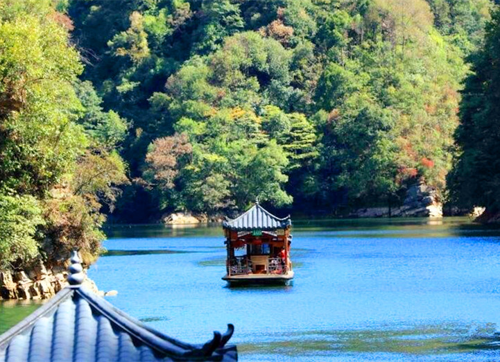 Stroll leisurely around Baofeng lake, a holy lake flanked by green trees and stone peaks of various shapes.