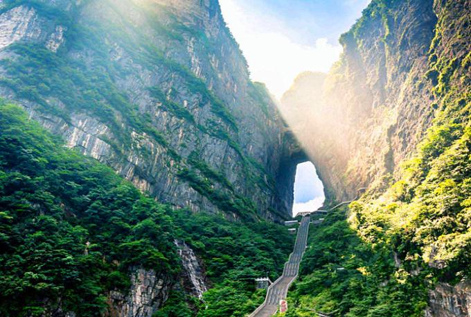 The journey is still ongoing. Today's first destination is Tianmen mountain (literally means gateway to the heaven) in Zhangjiajie city. As the highest mountain (1548.6m) in Zhangjiajie area, Tianmen mountain owned the longest cable car (7455m) in the world, which takes half an hour for one-way riding. On the cable car, you can have a bird view of the 99 curves Tongtian road. Enjoy the breathless walking along the glass bottom skywalk against the cliff. Then take the elevator to reach the amazing Tianmen Cave, the natural mountain-penetrating karst cave with the highest elevation in the world. Hanging on the towering cliff, it is indeed a big feast of your eyes!