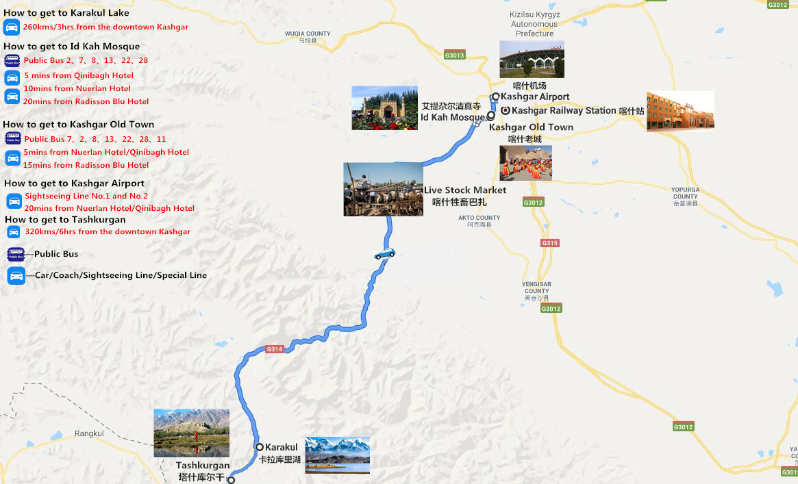 It takes 5hrs and 47 mins ( 288 km ) by car from Taxkorgan to Kashgar.
