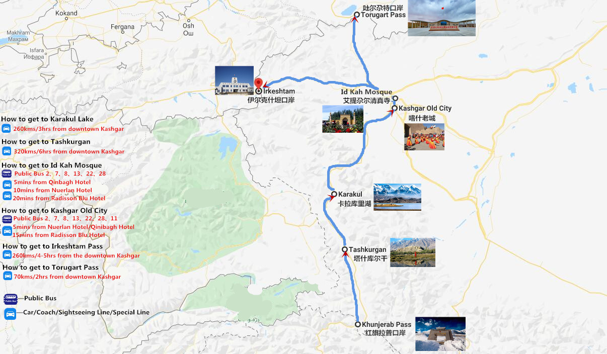 The Luxurious shuttle bus from Khunjerab Pass to Tashukurgan, Tashkurgan to Kashgar and Kashgar to Kyrgyzstan via Torugart or Irkestam Border have listed in the itinerary.