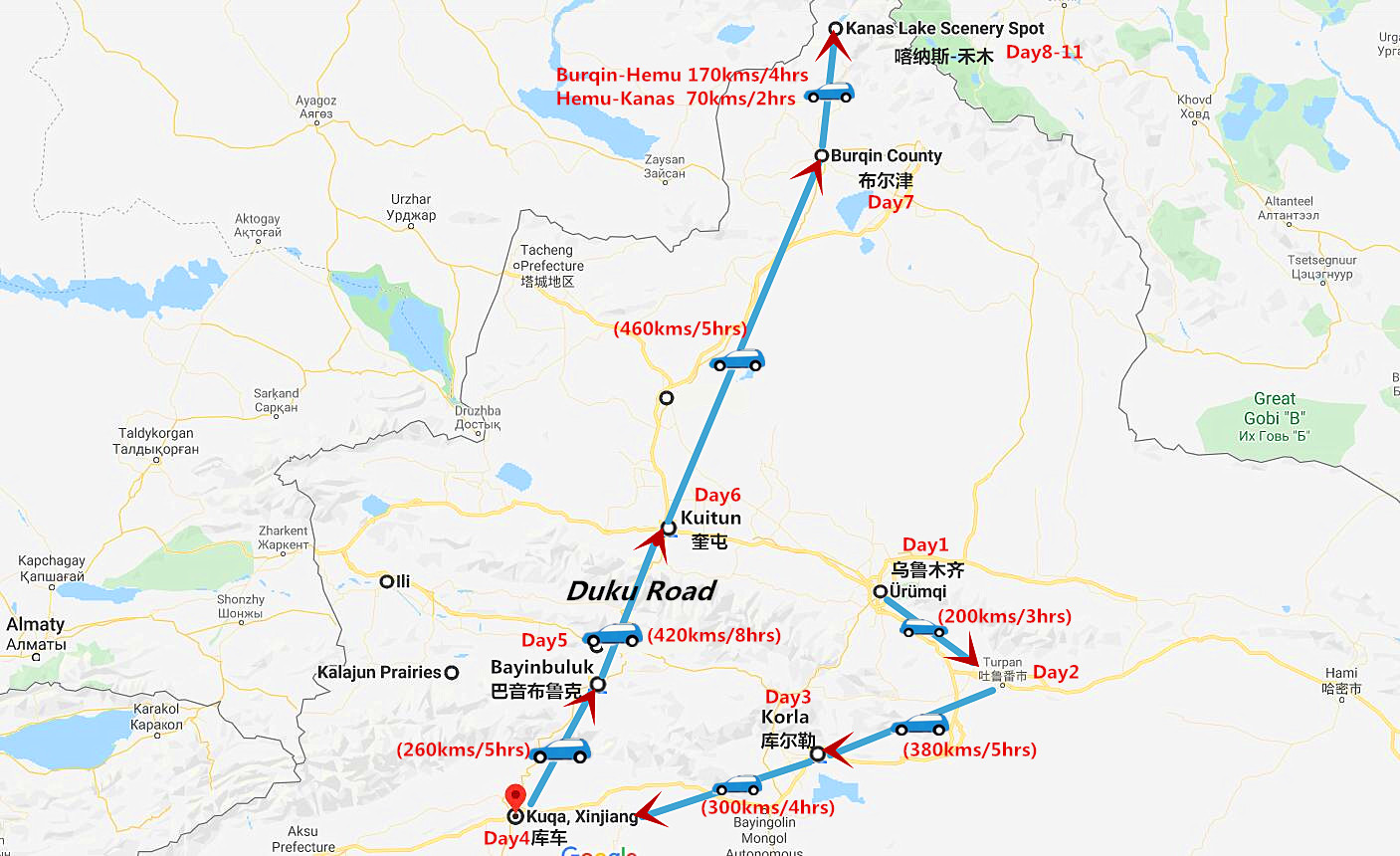 Destinations: Urumqi - Turpan - Korla - Kupa - Bayinbuluk - Kuitun - Burqin - Hemu - Kanas