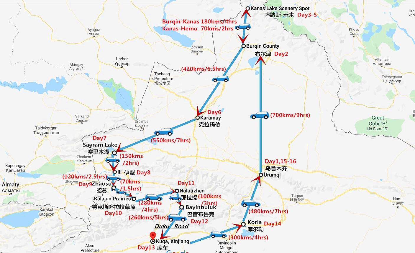 Destinations: Urumqi - Burqin - Kanas - Hemu - Karamy - SayramLake - Zhaosu - Yining - Tekes - Kuqa - Korla