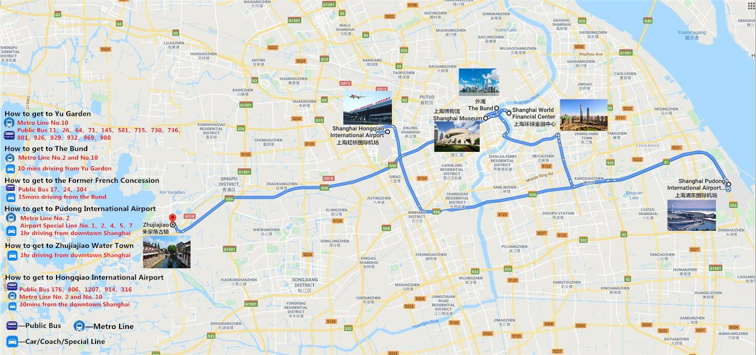 It takes 1hr and 6 mins ( 50 km )from Zhujiajiao Water Town to Shanghai City.