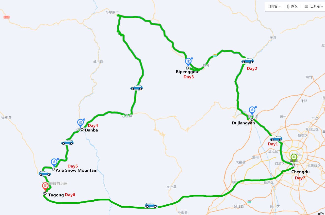 Destinations: Chengdu-Dujiangyan-Bipenggou-Daban-Yala Snow Mountain-Tagong