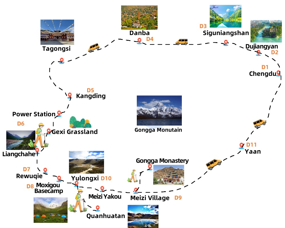 In the morning, start by exploring around Gongga Monastery and then head to Gongga Glacier. Begin by heading downhill and then start climbing. It will take about 3 hours to reach Shangzimei Village (3400m). Once you arrive, take a short break, pack up your belongings, and have lunch. Next, catch a bus to Zimei Pass (4550m), which offers an excellent view of Gongga Peak. The distance from Zimei Yakou to the main peak of Gongga Mountain is only about 5km! If the weather is clear, wait for the sunset and enjoy the breathtaking panoramic view of the golden Gongga Peak. After taking in the view, take a bus downhill to Shangmuju.