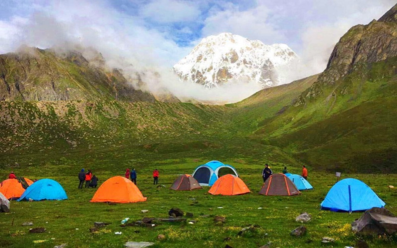 After breakfast, start from the Two Rivers and walk about 5 kilometers for approximately 3 hours until you reach Xiariwuqie. Then continue walking for about 1.5 hours to reach Shangriwuqie (4350 m). Along the way, you'll be able to admire the beautiful landscapes of Tianhaizi Snow Mountain, which is at an altitude of 6070 meters, and Xiaogongga Mountain (6027 m). You will camp at Shangriwuqie.