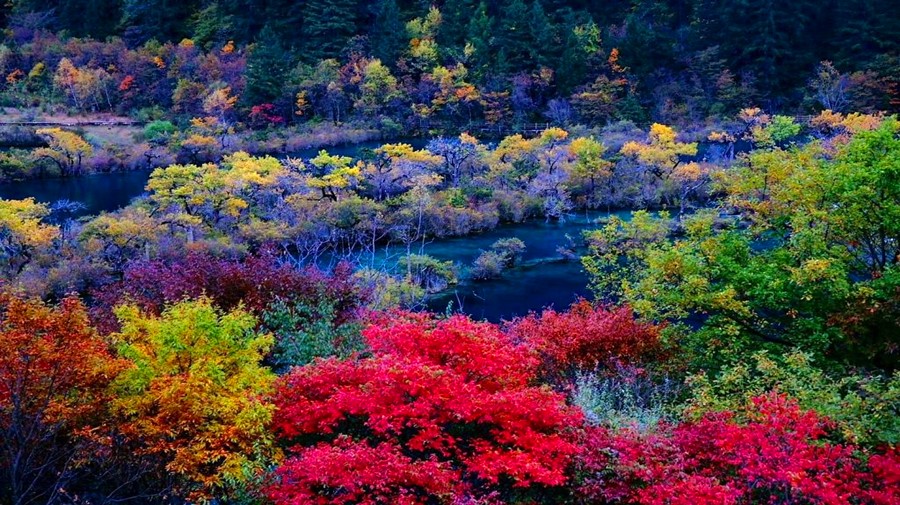 Exploration in Jiuzhaigou or Jiuzhai Valley, which is a picturesque fairyland, featuring charming natural scenery of colorful lakes, spectacular waterfalls, and mountains.