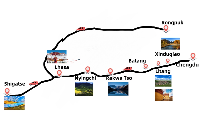 Destinations: Chengdu - Xinduqiao - Batang - Zogong - Rakwa Tso - Bomi - Nyingchi - Lhasa - Gyantse - Shigatse - Rongpuk