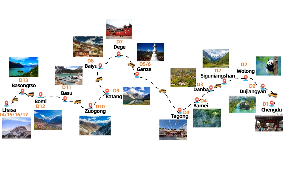 Destinations: Chengdu - Dujiangyan - Wolong - Aba - Garze - Changdu - Basu - Bomi - Lulang - Basongtso - Lhasa