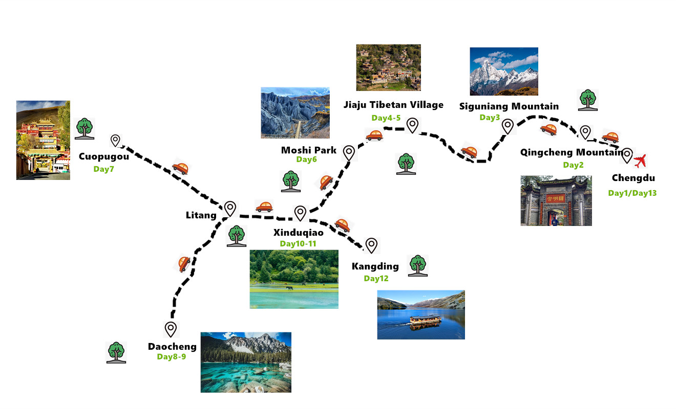 After breakfast, drive to Chengdu. Then you will be transferred to the airport and fly to your sweet home. Looking forward to seeing you next time.
