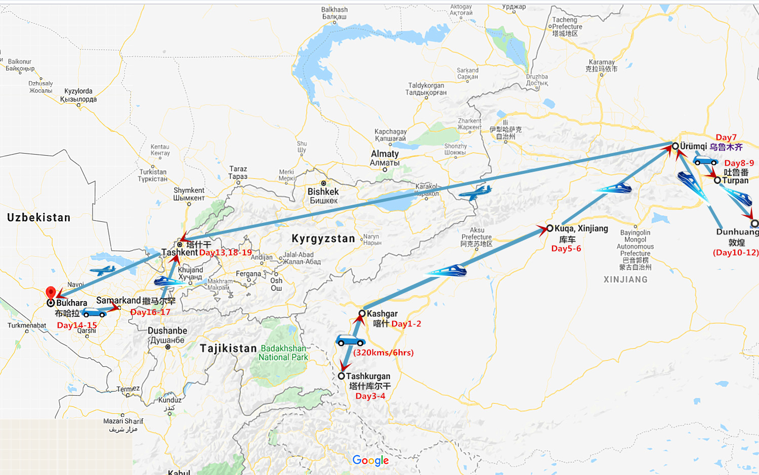 Domestic flights and 2nd class express train listed in the itinerary