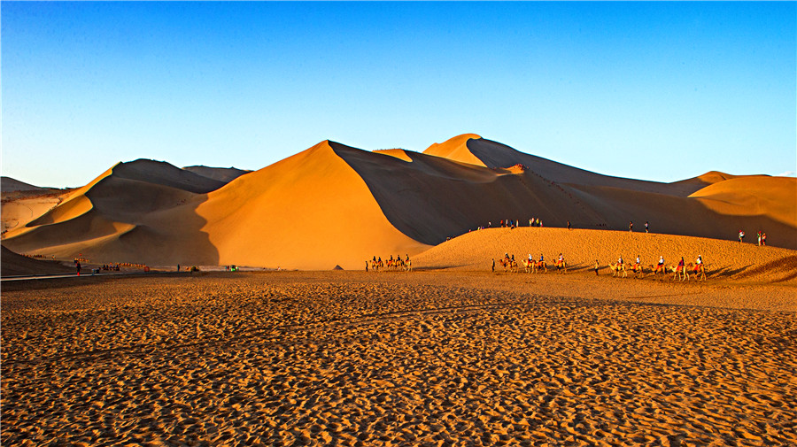 Ride camels up the dunes Echoing Sand Mountain and Crescent Lake of Dunhuang