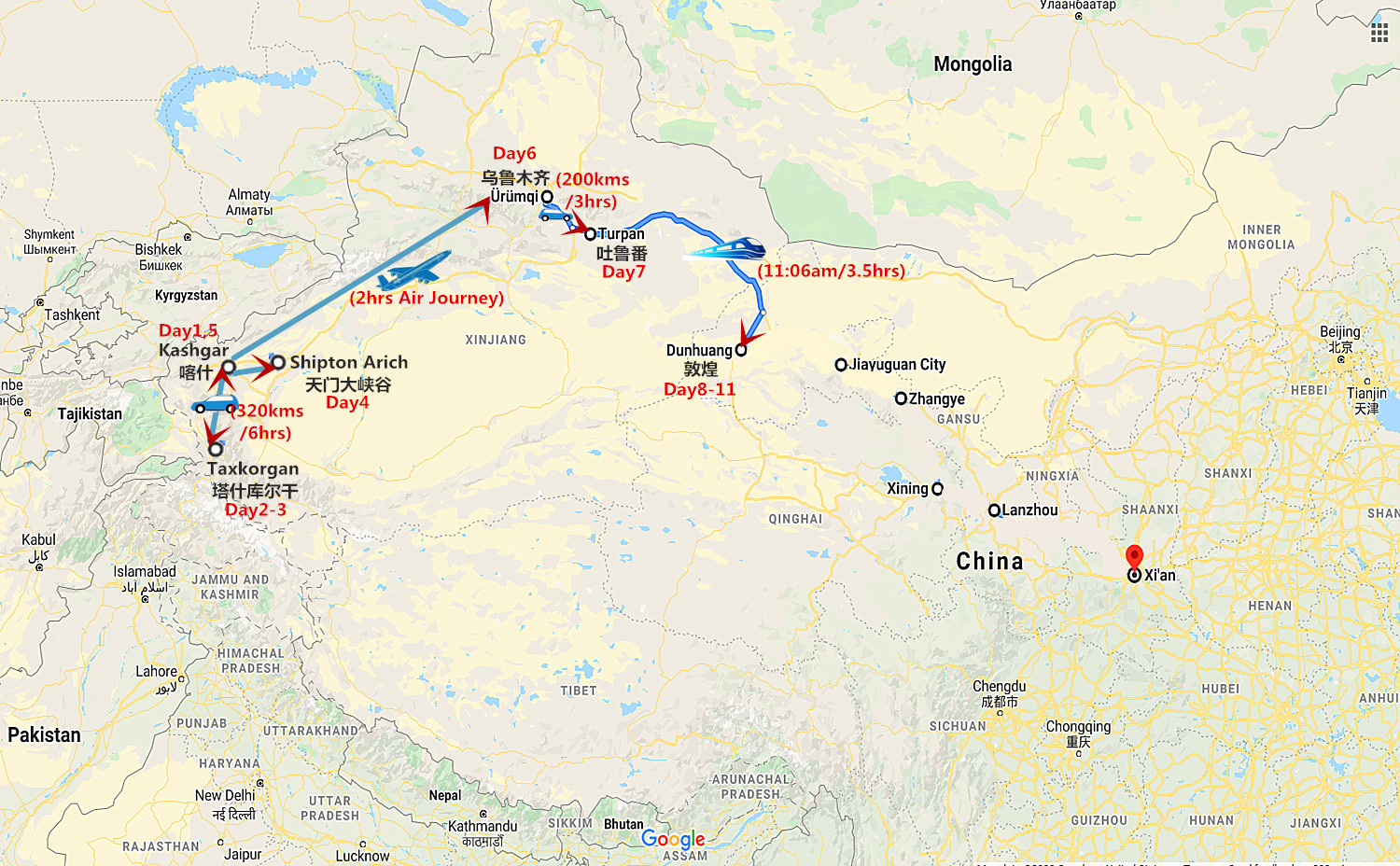 International flight arrive in Kashgar and leave from Dunhuang not indicated.