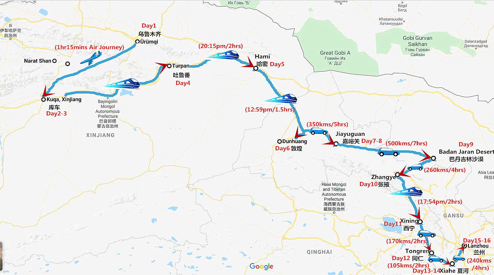 Destinations: Urumqi-Kuqa-Turpan-Hami-Dunhuang-Jiayuguan-Badan Jaran-Zhangye-Xining-Tongren-Xiahe-Linxia-Lanzhou